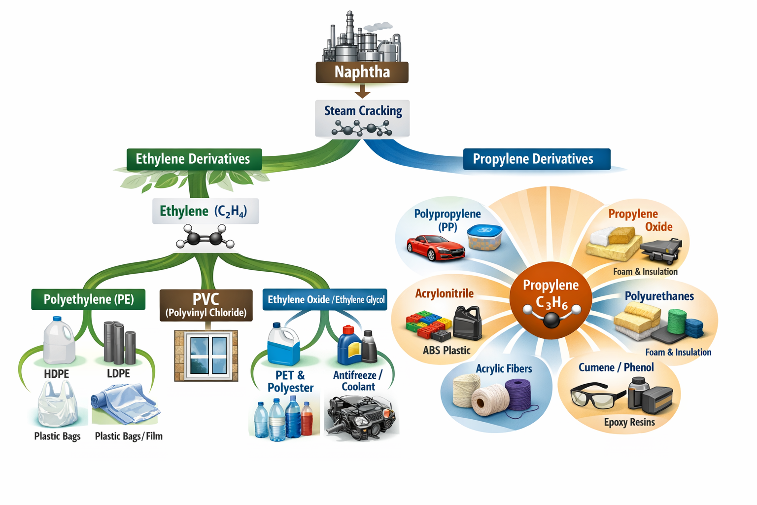 Naphtha is one of the lighter fractions refined from crude oil. It sits in the barrel near petrol and ahead of heavier products like diesel. Unlike those, naphtha is mainly used as a petrochemical feedstock rather than a fuel. In steam crackers, naphtha is broken down into smaller building blocks such as ethylene and propylene gases, which are then polymerised to become plastics like polyethylene (PE) and polypropylene (PP).